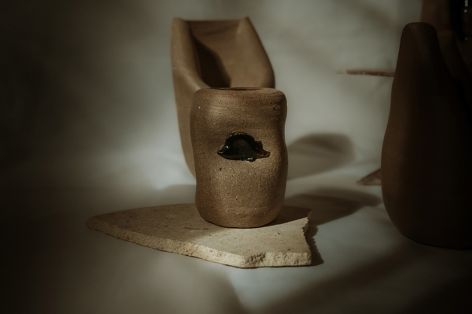 This is one of Juan Camilo Montenegro’s recent explorations with materials. In this pottery vase in earthen colours, he fuses clay and molten glass in a contrasting dialogue of strength and frailty.