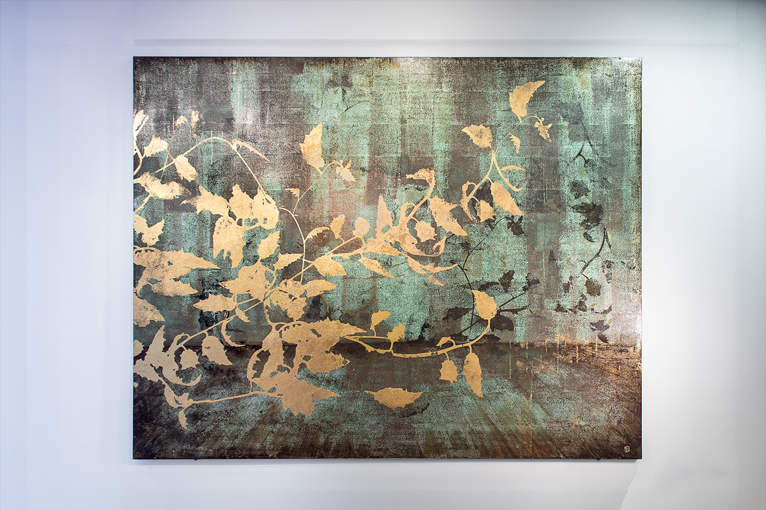 This is a gilded wood panel made with oxidised copper and brass leaf, and painted to look like a twirling plant against a forest backdrop.