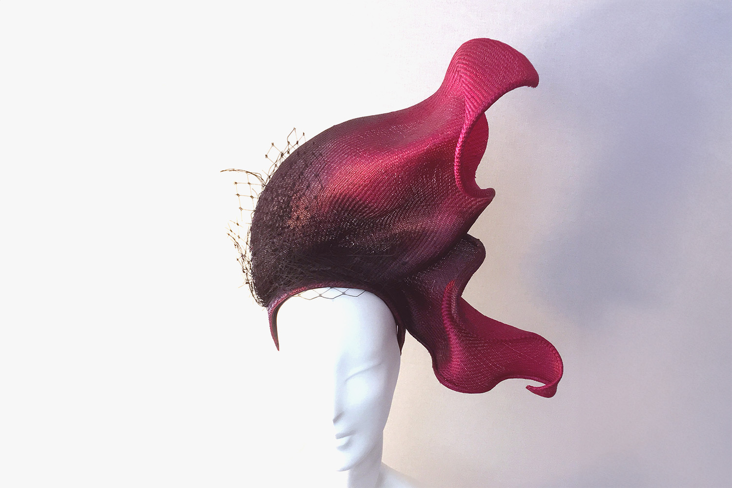 The Metamorphosis headpiece is handmade from straw parasisal tolook like abstract butterfly wings in movement. It is 'ombre' hand dyed from black to fuchsia pink with addition of a black veiling trim that does not cover the face.