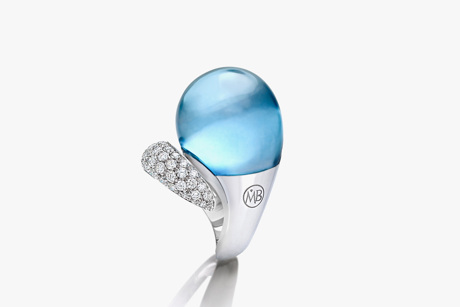 This iconic ring is crafted in white gold and its tail is studded with 39 diamonds for a total weight of 1.00 carats. It is the result of a process that originates from a wax sculpture. The topaz is hand cut and customised to fit the metal structure, then set.