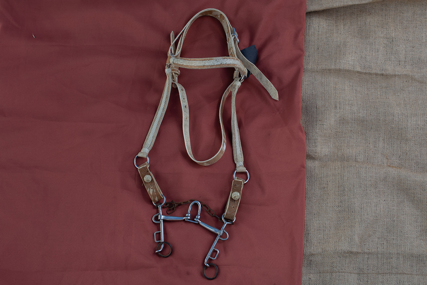 This piece is used by the rider to be able to steer their horse. The bridle should be placed on the horse's head, with the metal part (the bit) in the horse's mouth and the other end, made of leather with the detail of the browband, to be placed on the horse's forehead.