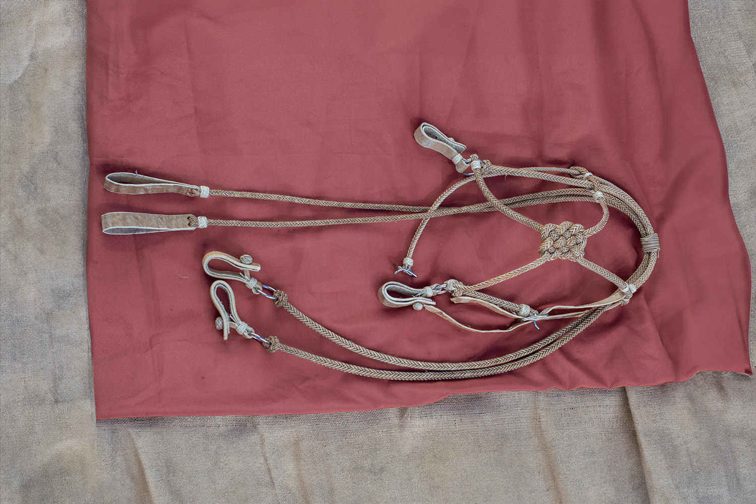 This piece is used by the Gaucho for horse riding. The cabezada, a piece identified by intertwined braids forming a knot in its centre, is placed on the horse's head, with this knot centered on the horse's forehead. The riendas, or longer braids, are the essential part which the rider (Gaucho) holds in their hands to ride and guide the horse's direction.