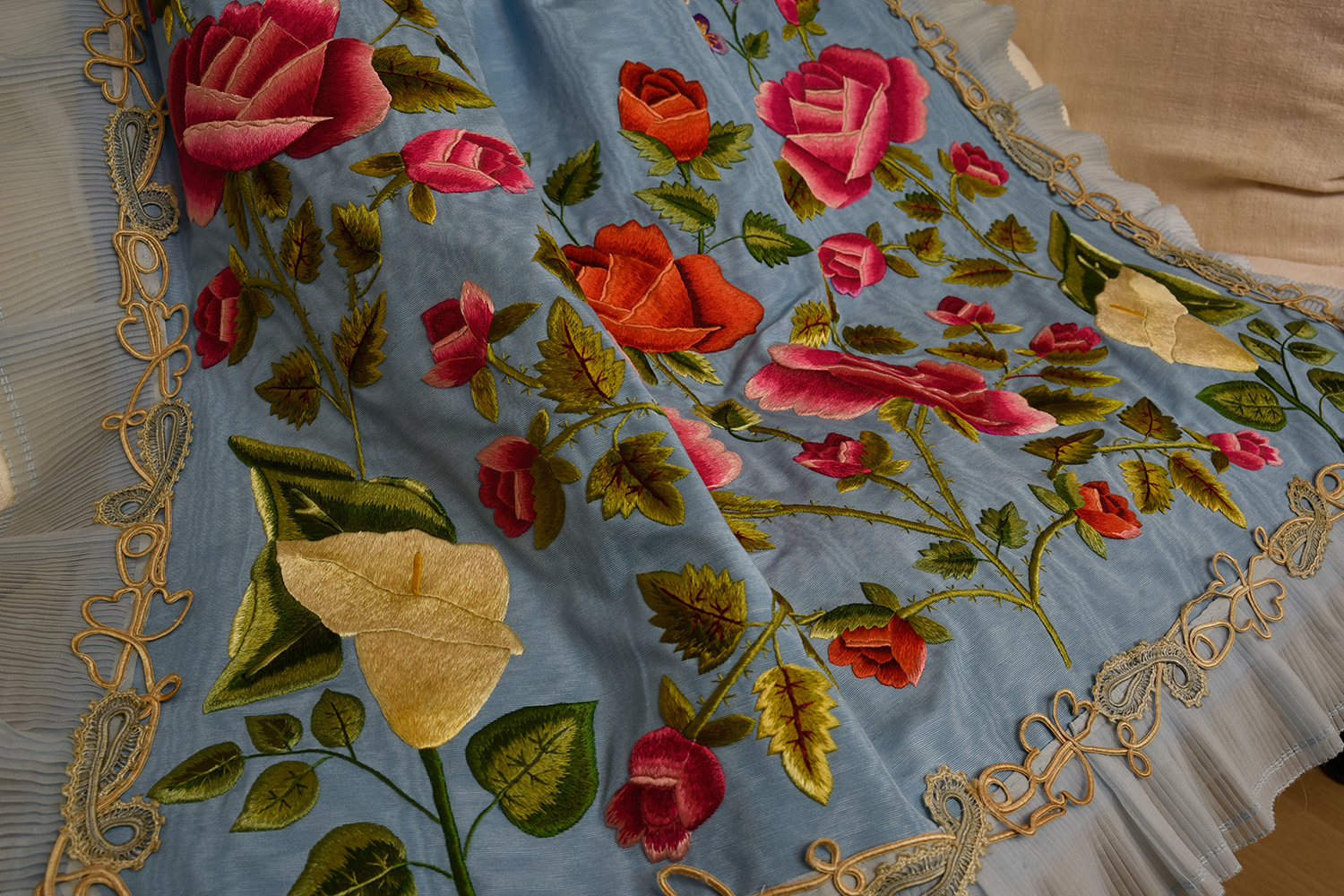 Old authentic trimmings shine again in this new interpretation of a local traditional woman’s dress. This hand-sewn apron was crafted with marbled silk, old trimmings and silk organza.