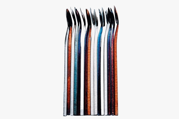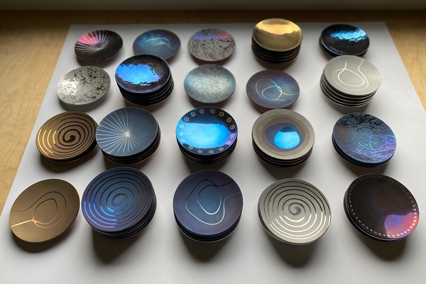 This is a large, round, stainless steel plate. It was formed by hammering. The middle part of the plate is polished and all the colours, blues and browns were made by oxidizing in a special colouring oven.