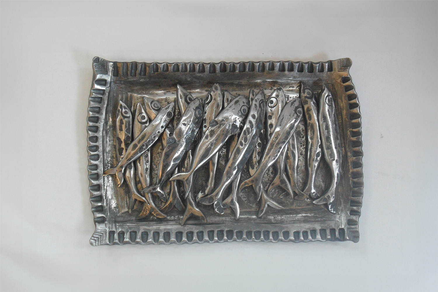 This tray was forged from a thick iron plate and the sardines from individual pieces of iron with a circular cross section. The title refers to the Christian holiday commemorating the crucifixion and death of Jesus. During Lent, no meat should be eaten on Fridays, but fish is allowed instead.