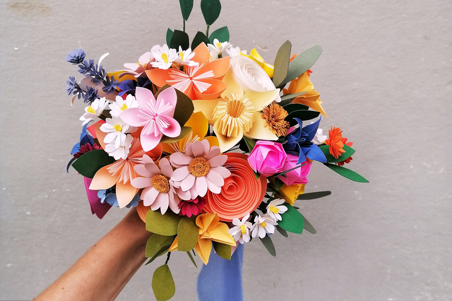 This bouquet of paper flowers was made with the origami technique: each flower is made by hand starting from sheets of coloured paper and cardboard, folded and cut out. Each flower has a paper stem with a wire core.