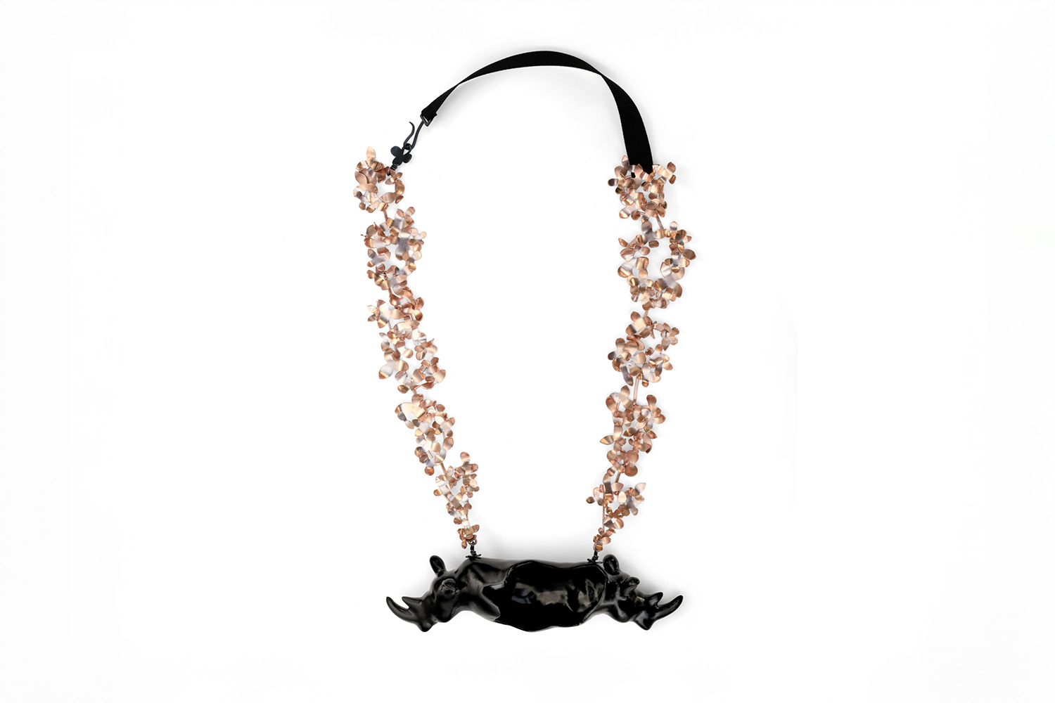 This necklace was inspired by the unconscious mind of human beings. Each rhinoceros head symbolises the conscious and unconscious, which seem to be the opposites but are connected seamlessly to one another. They are painted with layers of Japanese lacquer to achieve a deep black colour. The bronze flowers add a dreamy sense to the piece.