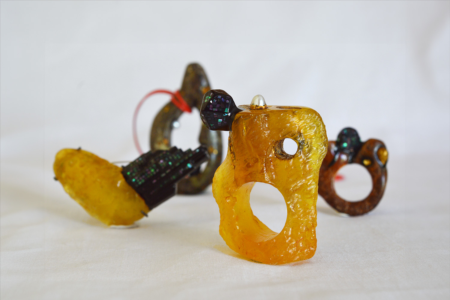 This collection consists of two rings, one brooch and one necklace made with raw amber. All the amber parts are hand carved, respecting the original form of the material. Very thin and small sheets of mother-of-pearl are applied on the lacquered surface with the use of Raden, a Japanese decorative technique.