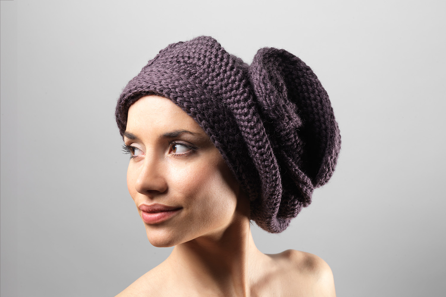 This is a contemporary turban in parma-violet, elegant and soft. It protects well from the cold and was made using experimental turban-shaping techniques.