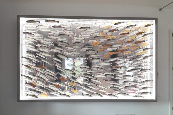 Floor, wall panels and decorative fish inside the water tank are all made with full colour-body porcelain. All of the fish are species from the Aegean Sea.
