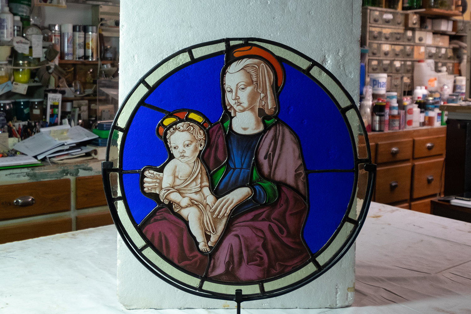 This stained glass window is a copy of the Madonna with Child by Francesco del Cossa (1467-68), located in the Jacquemart André museum, in Paris. Made for a private collection by Massimo Travagli, this piece is blown glass painted in grisaille and fired at a high temperature.