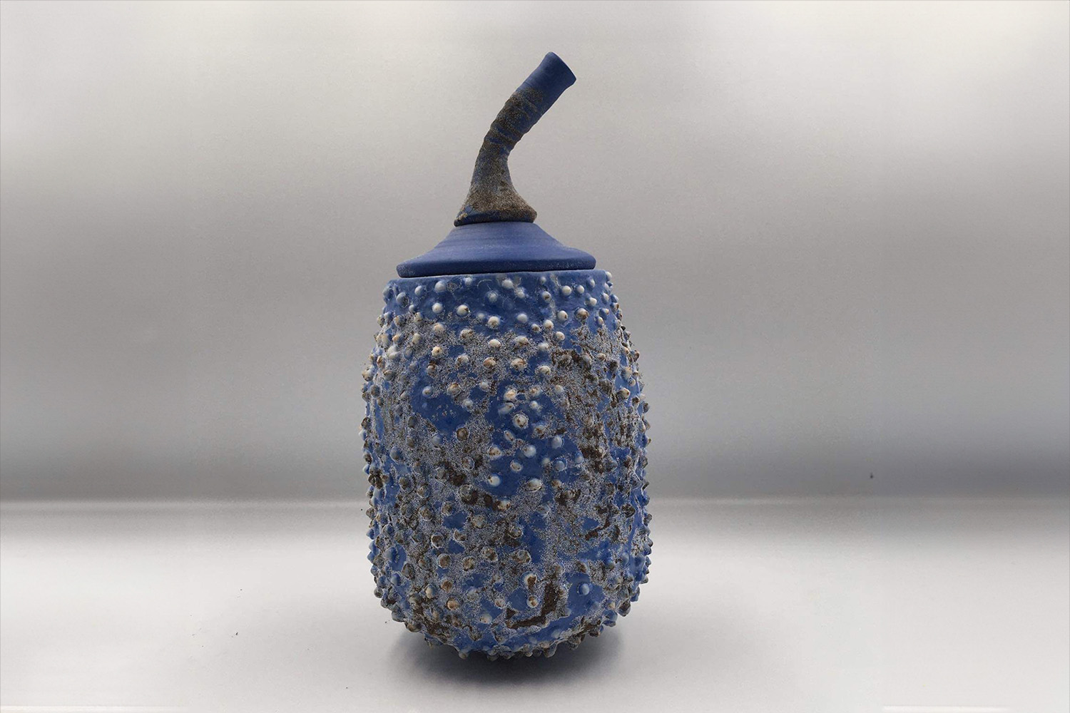 This playful prickled blue and grey glazed fruit has a lid that can move in different positions. The piece belongs to the Strange Fruit series.