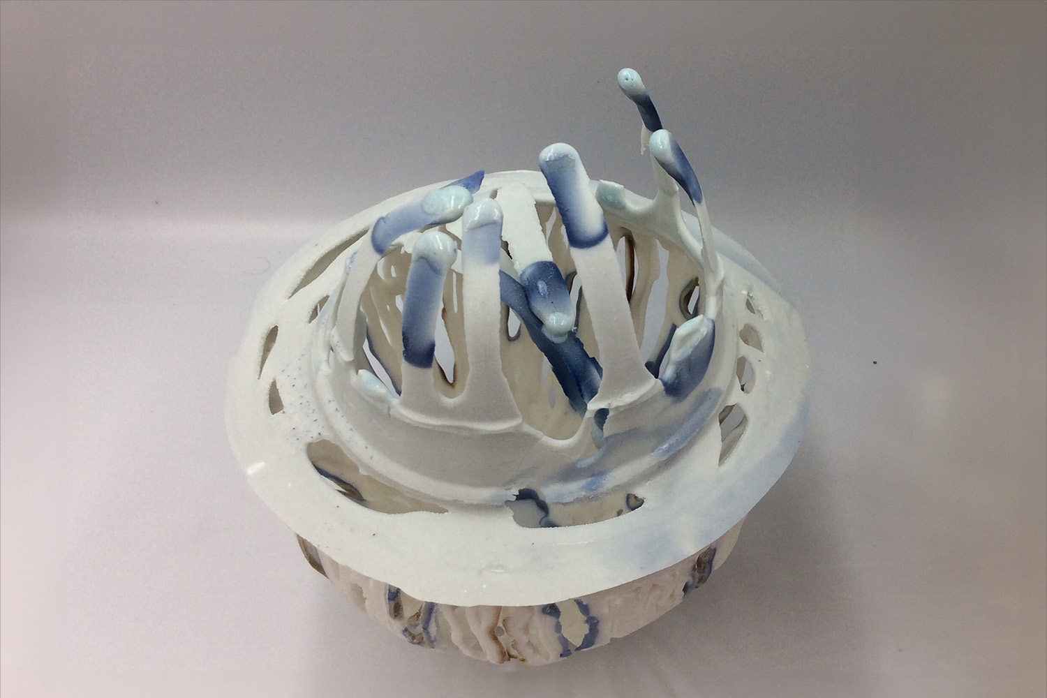 This is a small creamy white sculpture with a translucent blue watercolour surface that is unglazed. Its tentacles gently unfold. The piece belongs to the Anemone series.