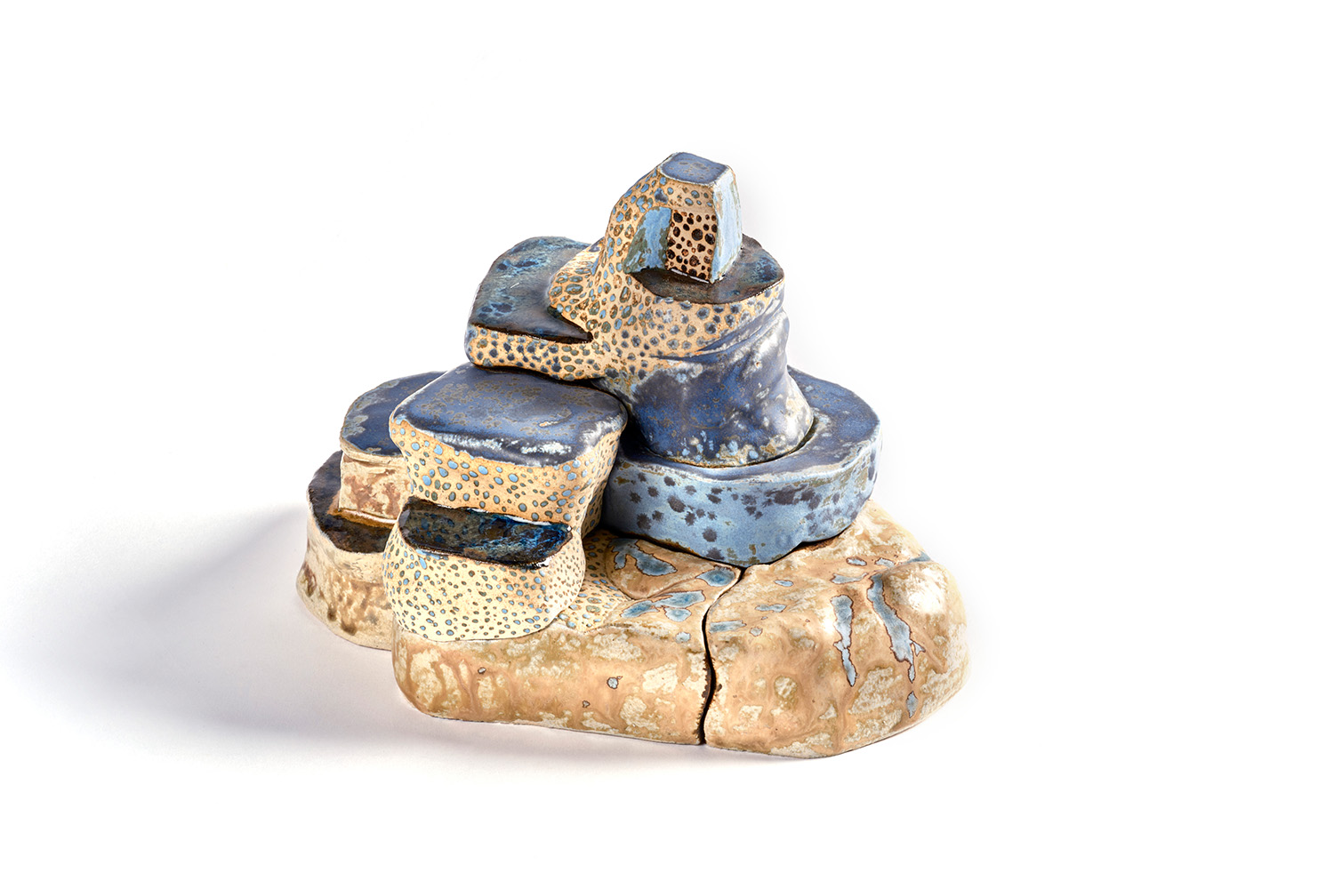 This is a landscape construction made up of six blocks. It is a piece that can be built and deconstructed. The colour palette contrasts between the shades of blue water, sky blue and a mixture of brown or ochre earth.