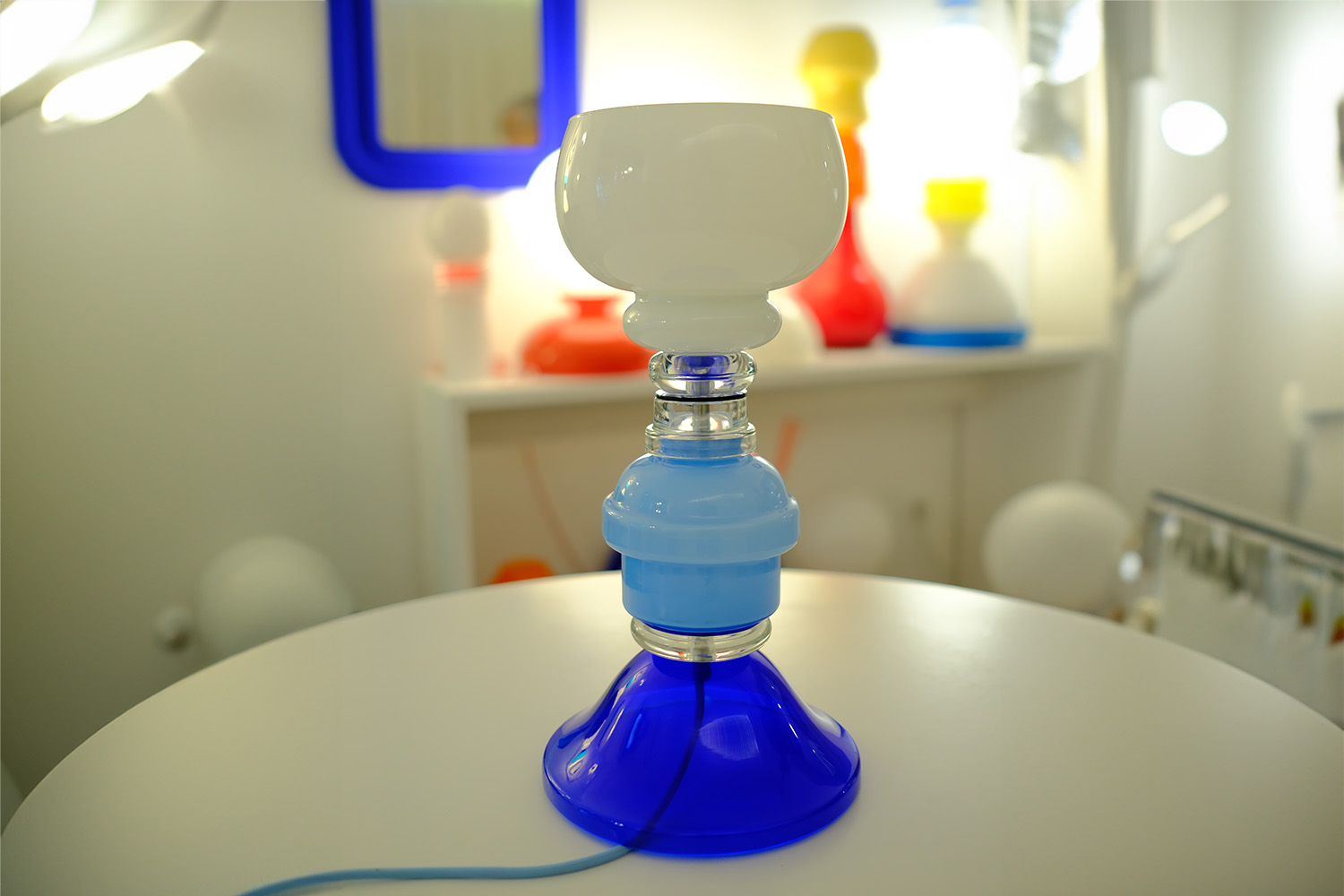 This is a sky blue, cobalt blue and white table lamp made from solid upcycled glass. There is a band of transparent glass separating the coloured layers.