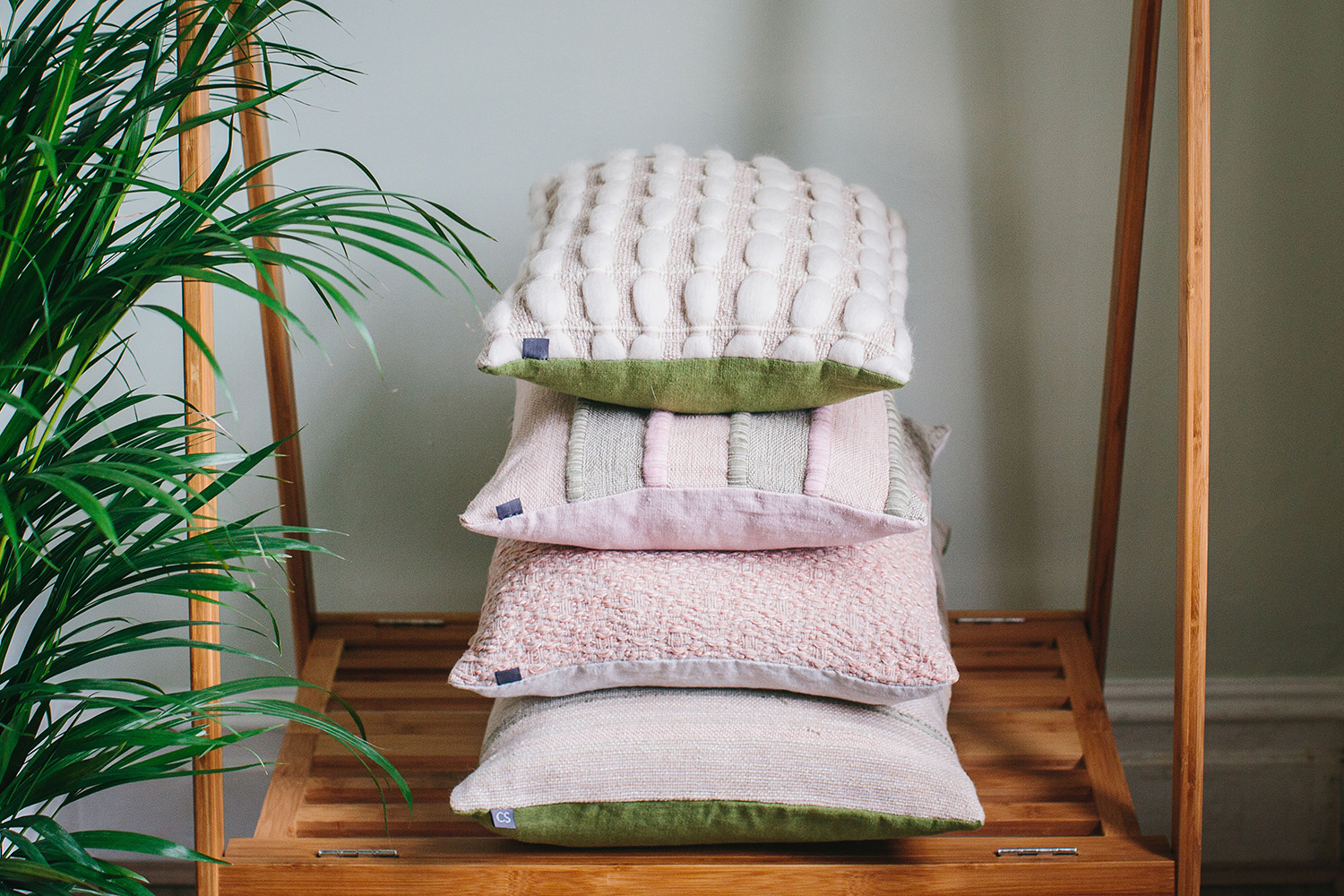This collection of handwoven cushions features a variety of materials, with the wool roving hand-laid into the woven fabric whilst on the loom. From top to bottom, the cushions are: Pebbles, Sunrise, Waves and Silt.