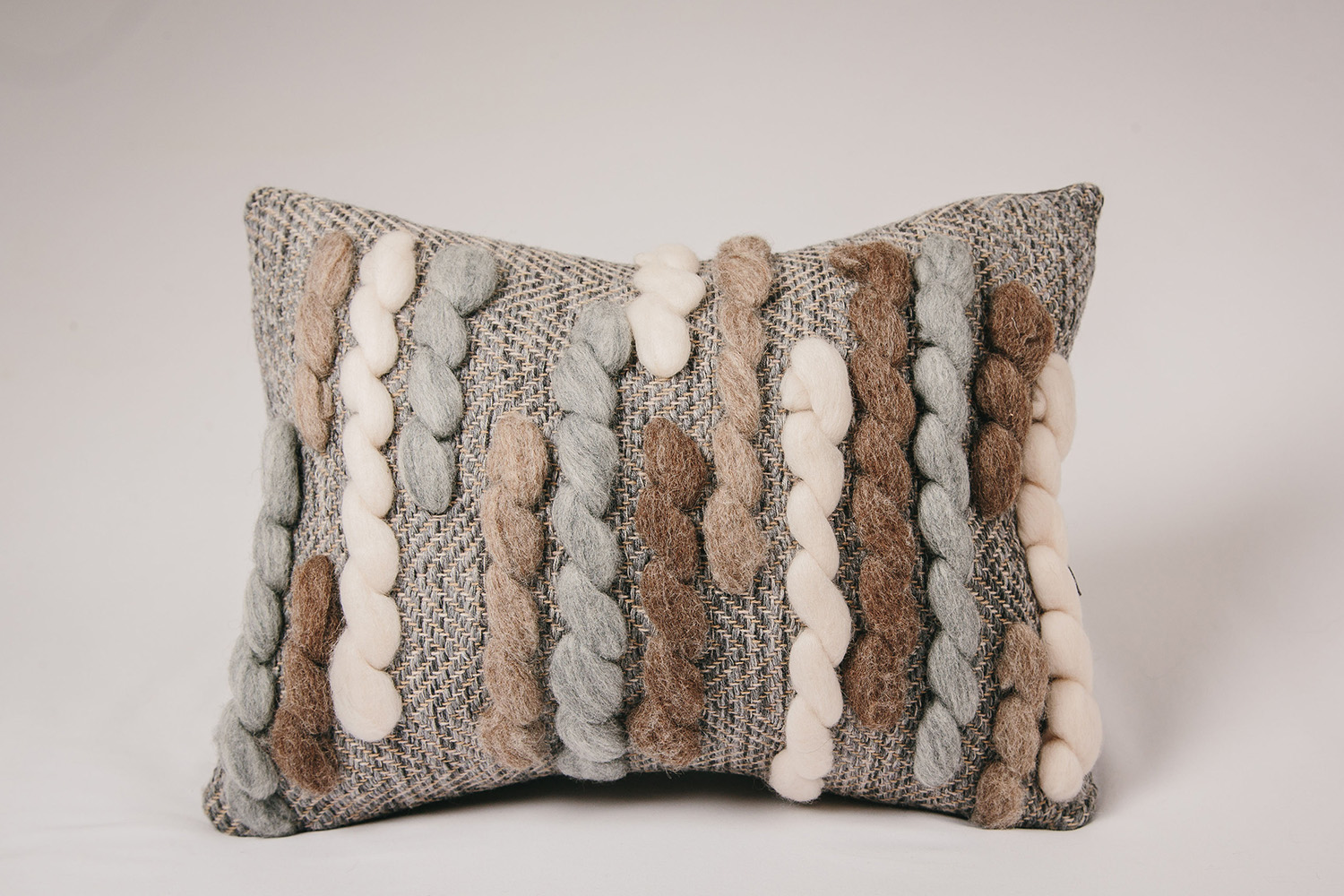This is a handwoven cushion featuring wool roving waste fibres, hand-laid whilst on the loom.
