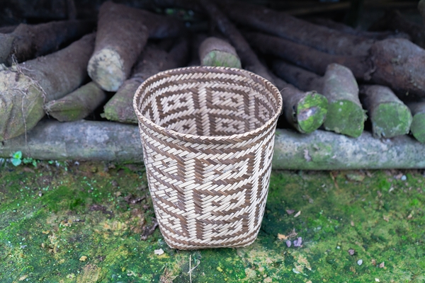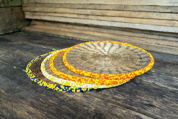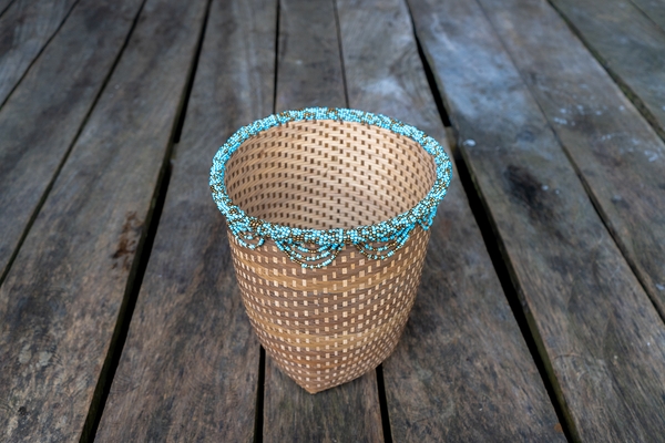 This round basket is made with traditional basketry techniques, with big green, blue, and golden beads, all around the top. It can be used as a paper bin, magazine container, or flowerpot, among others.