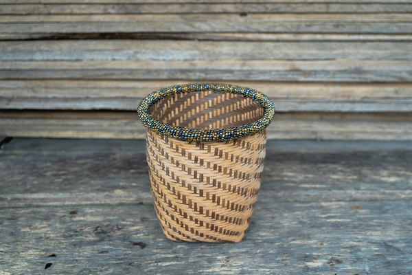 This flowerpot was made from Iraca palm, through a basketry process. It has large colourful beads along the top edge.