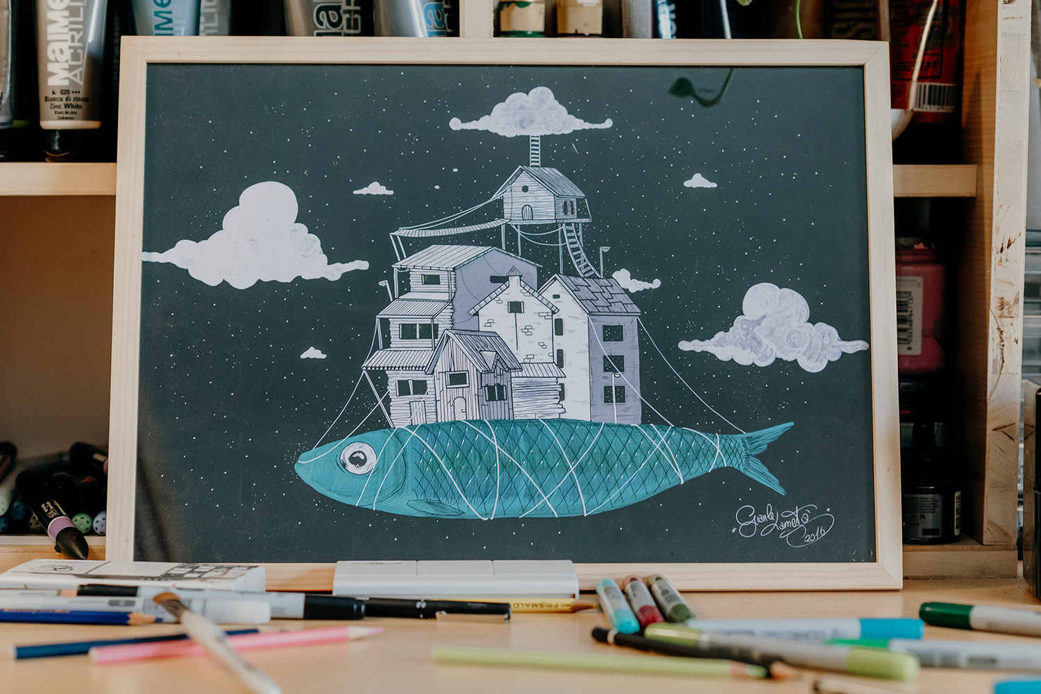 This drawing represents a large fish flying mid-air, with a few houses on his back. It belongs to the Unreal Dreams series. It is made using acrylics and ink on black paper.
