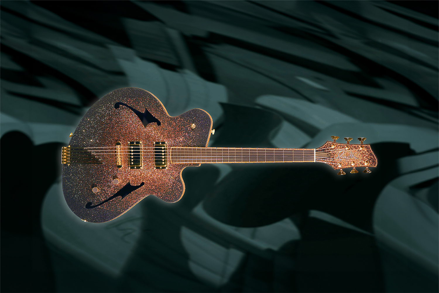This guitar is completely covered in Swarovski crystals, arranged in a sunburst pattern with several colours in a gradient from golden yellow to orange and dark brown. "If Liberace had given Elvis a guitar, this is probably what it would have looked like!"