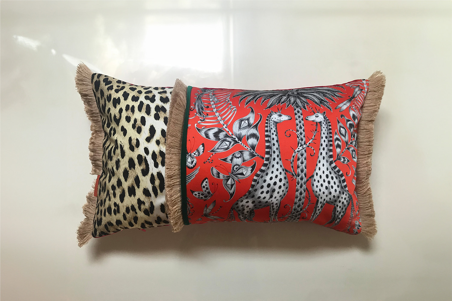 The front of this cushion consists of two cotton panels, one printed with a leopard pattern and the other with animal and fantasy motifs. The fringes of the cushion are placed on the right and left. The two fabrics are joined by a dark green border and fringes in golden beige. The reverse of the cushion is one plain colour, red velvet.