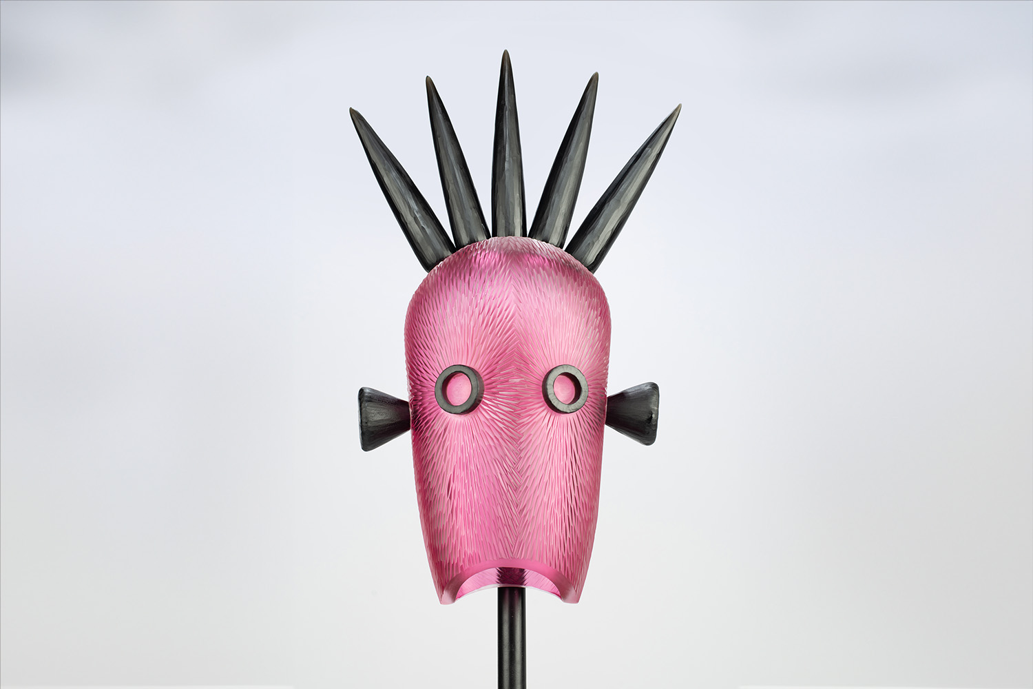 This graphic pink mask features black spikes, two ears and two round eyes. The piece is sculpted from glass and carved on a steel stand. Different processes were involved in its creation, including glassblowing and lathe-cutting.