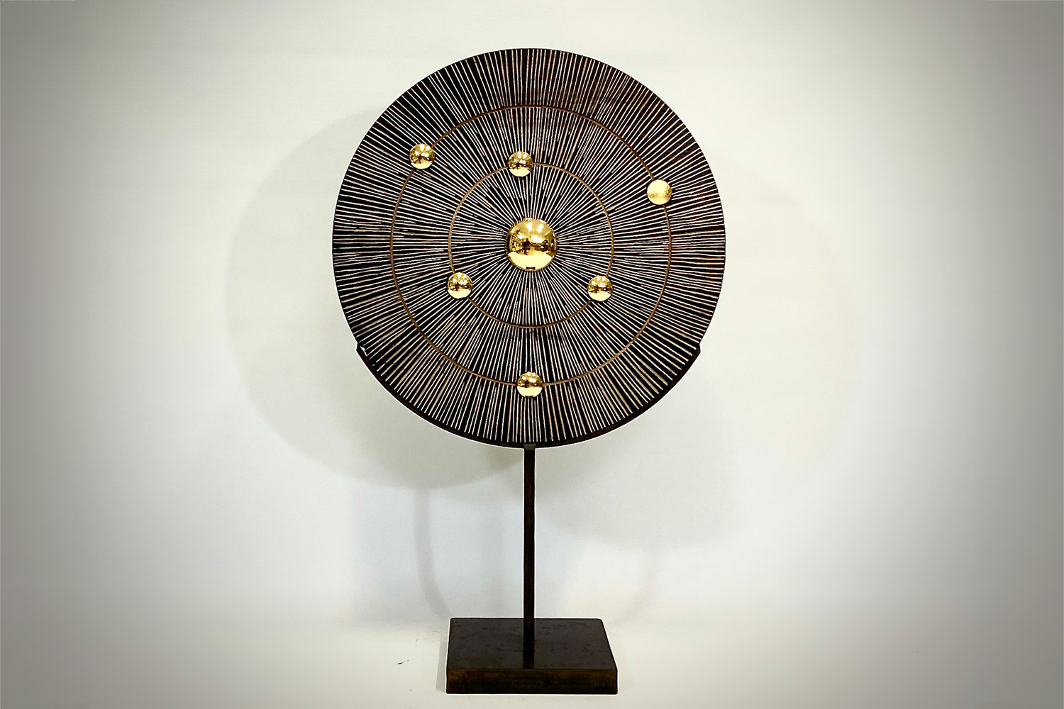 Featuring a perfect round shape, this sculpture was hand-carved in solid oak wood. It is adorned with gold dots applied using the traditional technique of gold leaf gilding. The piece stands on a steel base.