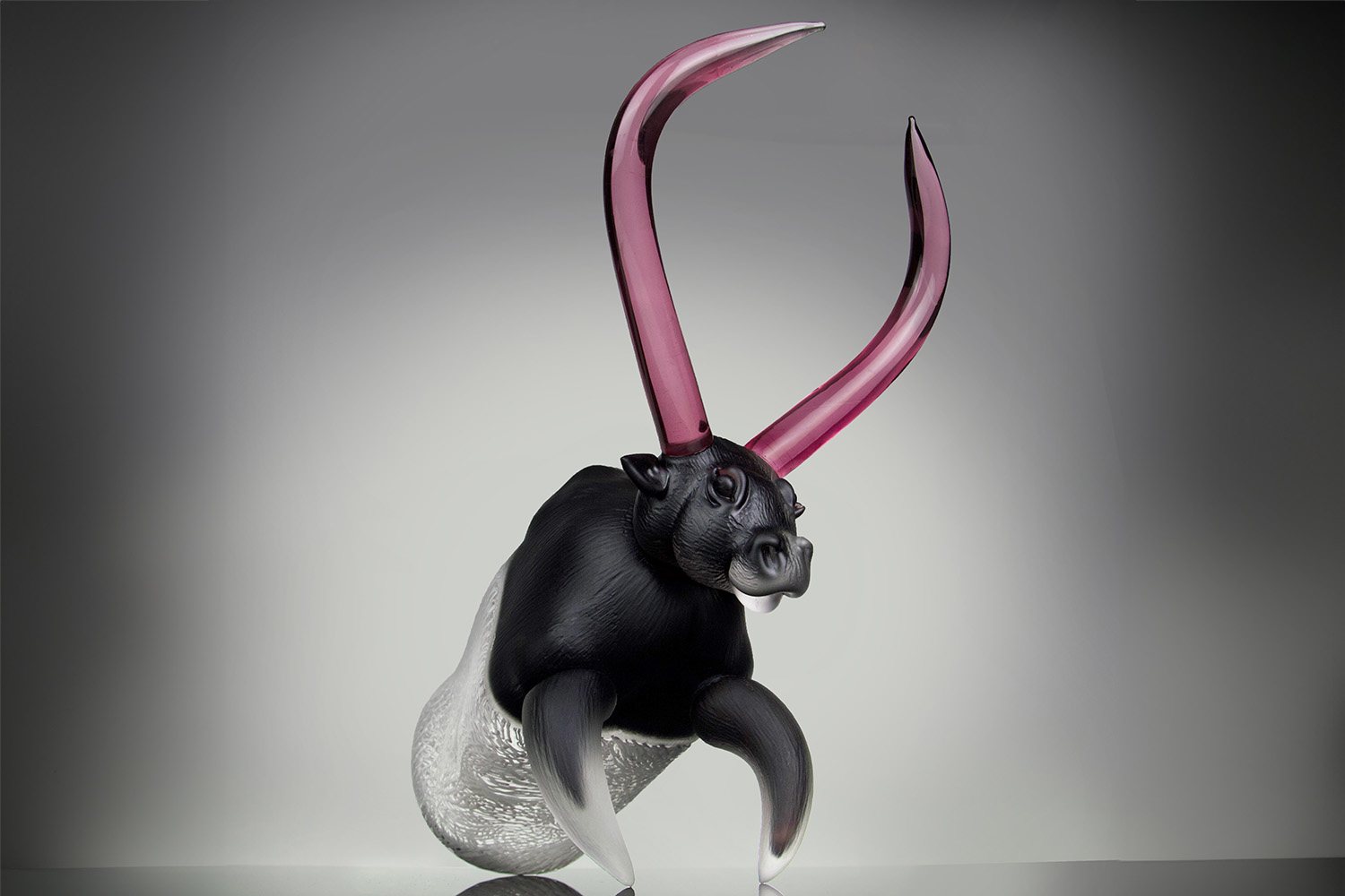 This glass sculpture features a bull with solid pink horns and a murrini back with a detailed pattern. In addition to the contrasting colours, the parts present a carved texture.