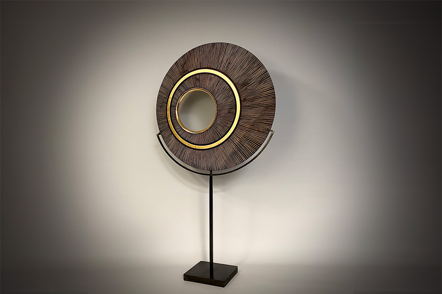 This refined round sculpture was carved in solid oak. It features lines that have been meticulously carved by hand. In addition to the carving, the gold leaf gilding technique was used to enhance the piece. The piece stands on a steel base.