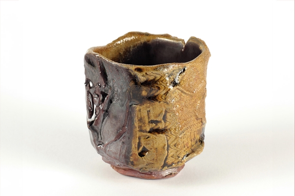 This is a round shaped stoneware vase, thrown on the potter’s wheel and fired in a reduction atmosphere (wood fired then gas fired). It was finished with a white Shino glaze and grapevine wood ashes.