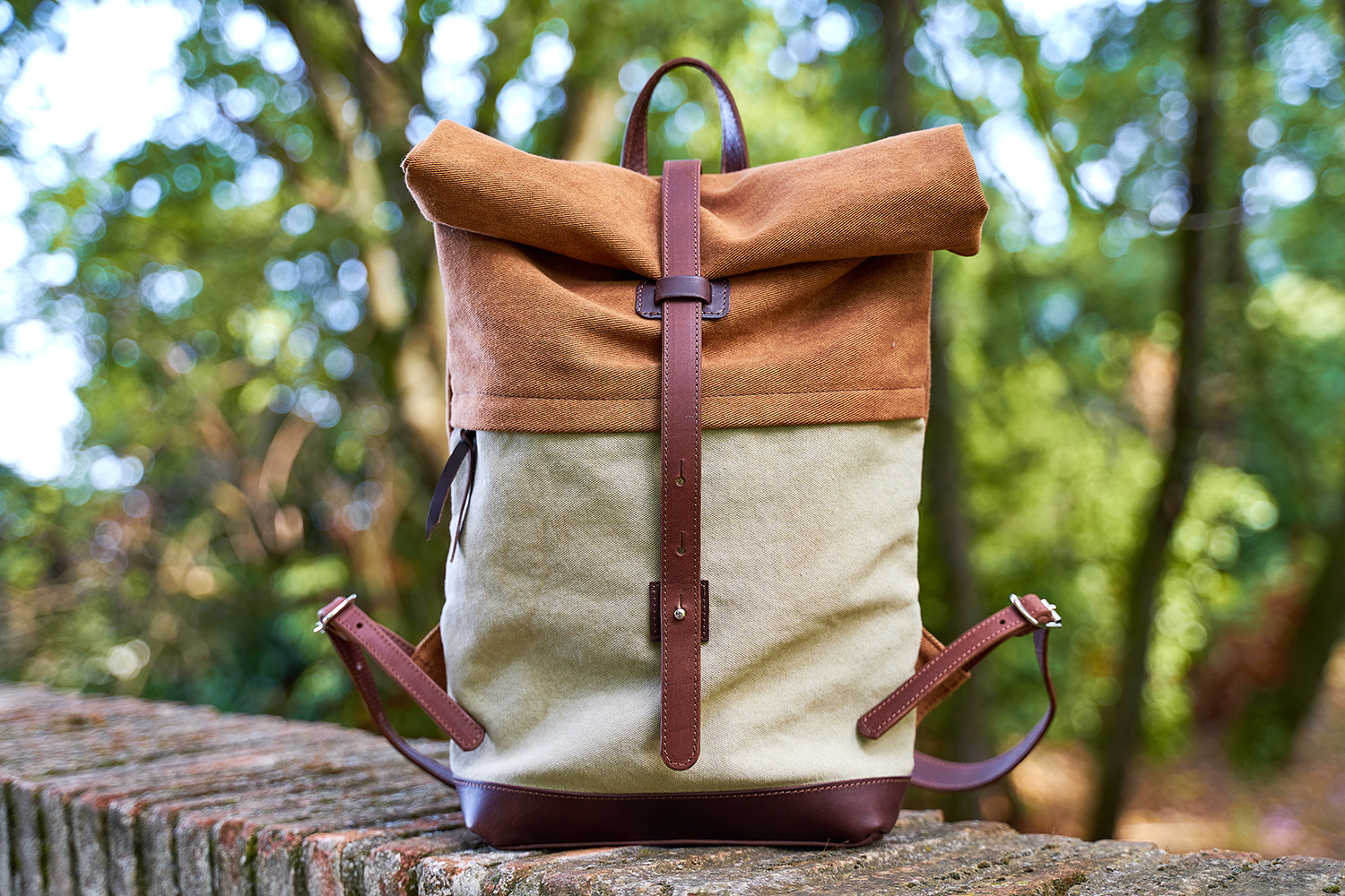 The roll top backpack, the very first item created by Michela Francesconi, is a spacious and comfortable bag suitable for all activities, casual for a walk in the city, sporty for an excursion, roomy for the gym. It is naturally elegant thanks to the vegetable-tanned Tuscan leather and organic cotton fabrics.
