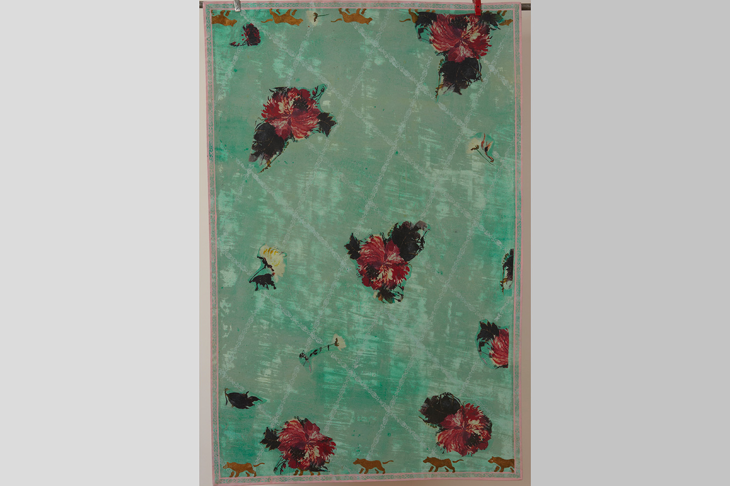 This rug is made out of sailcloth weighing 600g per square metre. Suleika Ulmen worked on this base in various techniques: turquoise acrylic paint, cyclam silk fabric with a flower print and gold pigments. As a final touch, coatings of special lacquer finish make the fabric’s surface durable.