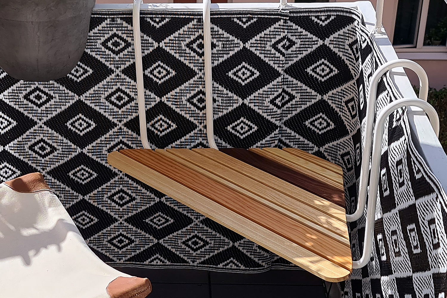 This is a hanging corner table or stool that can be hung on a balcony railing. The top is made out of wood slats in different widths and lengths of pine, Oregon pine, ash and walnut woods. The hanging device is made out of metal pipes and painted white.