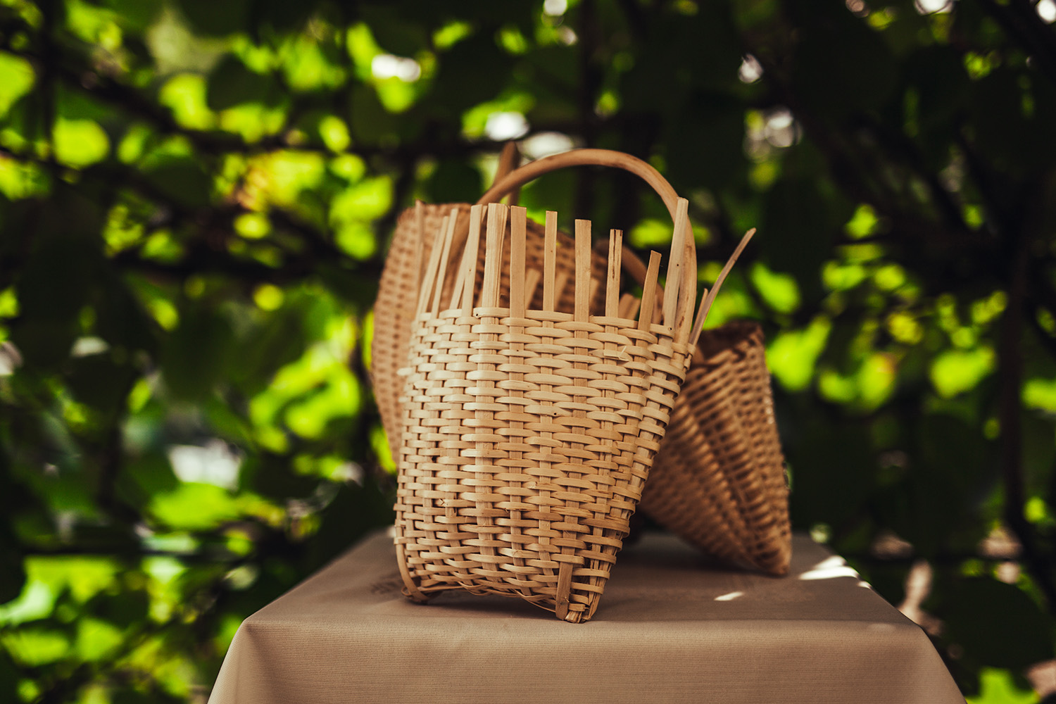 This petite wicker basket with a semi-circular handle and an uneven base was designed for gathering fruits such as cherries. It is a traditional design, characteristic of Selca Valley. Crafted from hazel branch strips with a spruce root finishing braid, the vertical cross-section takes on a U-shaped form.