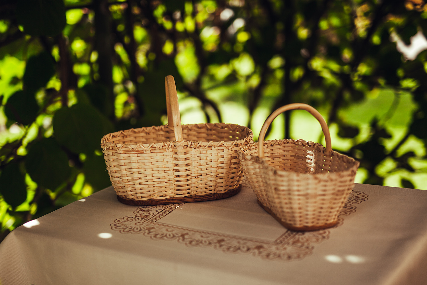 Škundra is a basket with a sturdy wooden base, ribs, a convenient handle, a decorative hazel wood braid and a finishing spruce root braid.