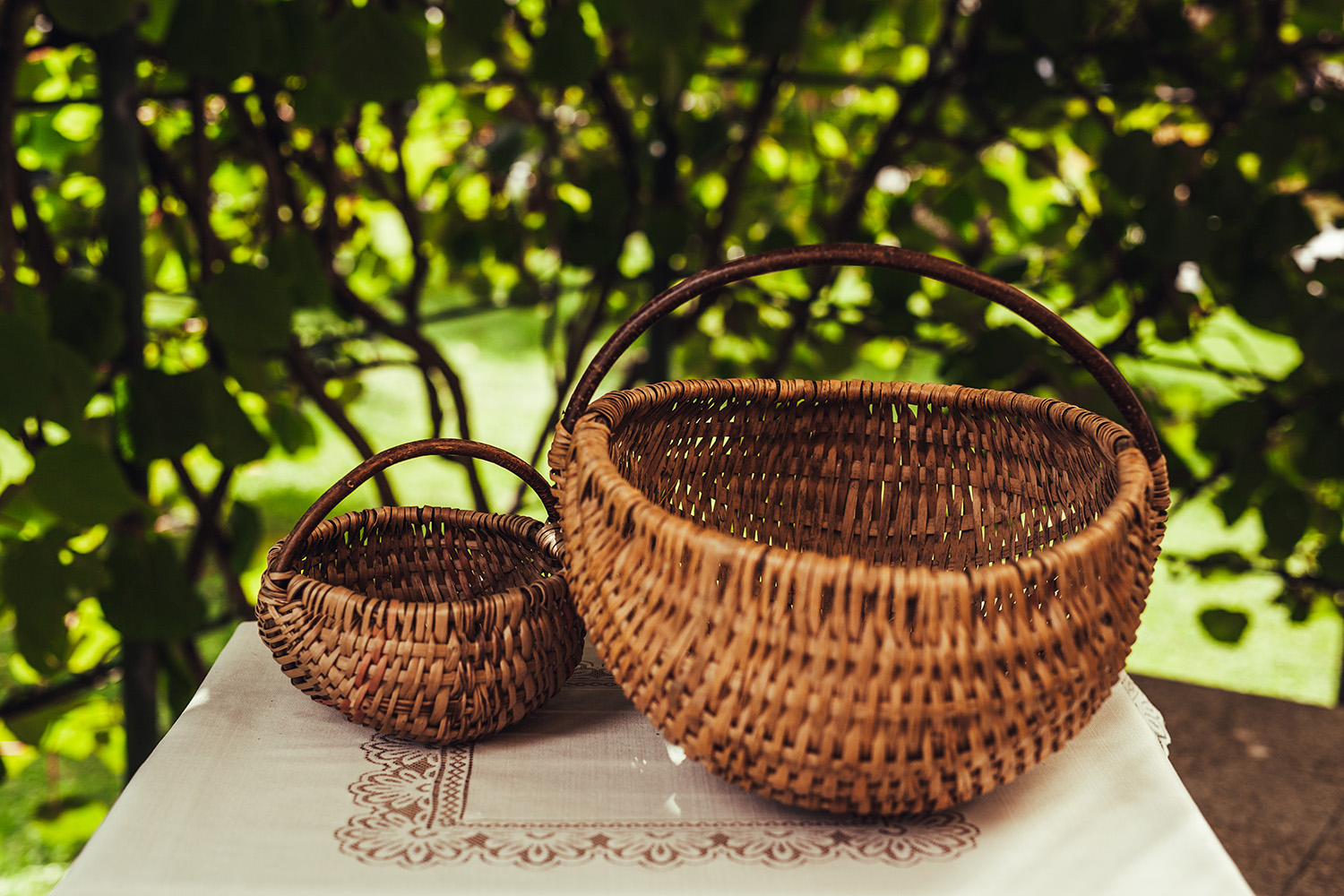 The cajna, a traditional round frame basket made of hazel wood, features a distinctive semi-circular handle and an irregularly shaped base. It serves various purposes such as collecting field products, herbs, storing teas, or even as an elegant shopping basket.