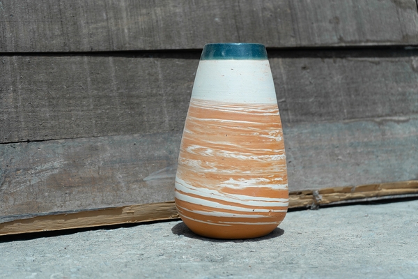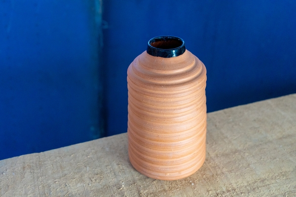 This vase was made on commission for someone who wanted a piece that was diagonally painted with blue enamel, and the other half with traditional terracotta. It is the perfect example of a piece that combines the traditional and modern techniques that make Laureano Melo's work so unique.