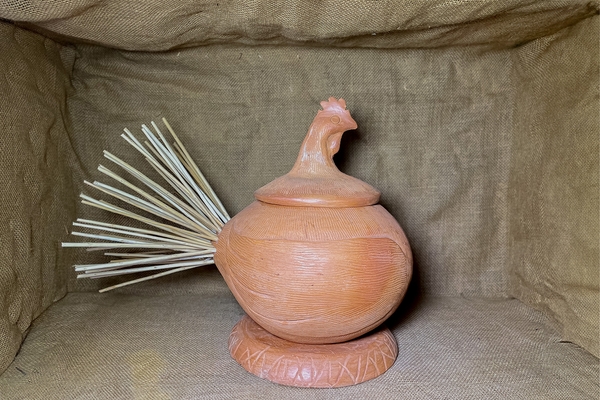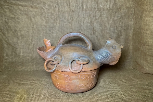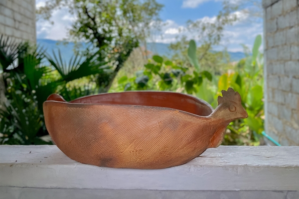 This piece is handmade in red clay, by the artisans of Julia Castillo’s workshop. It is a utilitarian container, which is traditionally used to serve soup. It consists of two parts: the body of the hen, with its two wings, and the lid which is the neck and the head of the hen.