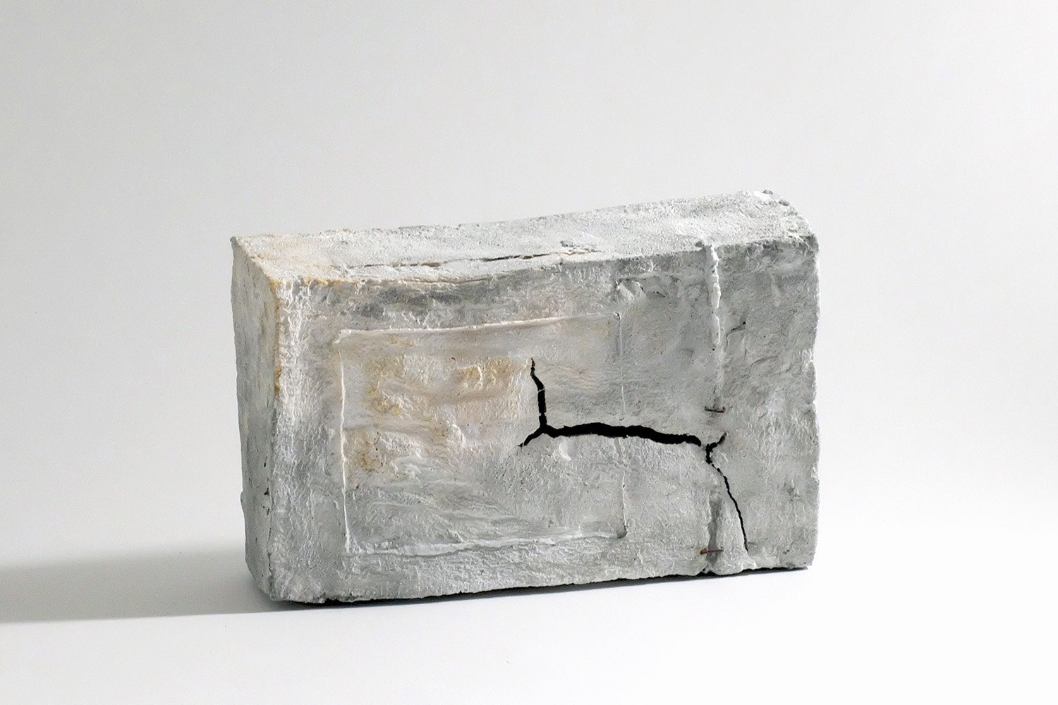 This square block is made of glass. The surface texture and colour scheme of the work at first glance do not give the impression of glass. Although hollow, the piece does not allow light to penetrate, and the dark space glimpsed through the cracks evokes inner space.