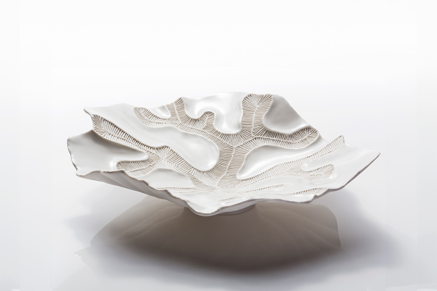 Nympha is a white porcelain centrepiece that belongs to the Fossilia collection. The glossy surfaces contrast with the unglazed parts decorated with a detailed and hypnotic texture recalling madrepore corals.