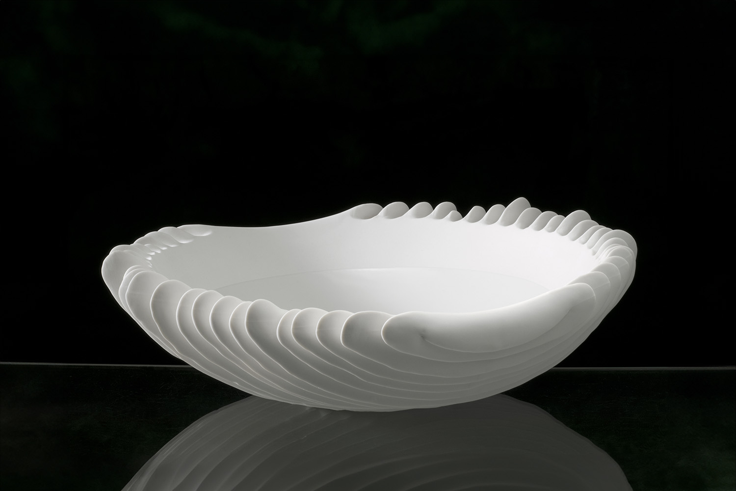 This white porcelain centrepiece is part of the Novalis collection. This artwork is decorated with sharp blades, which, when touched, recall smooth shells and rugged fossils.