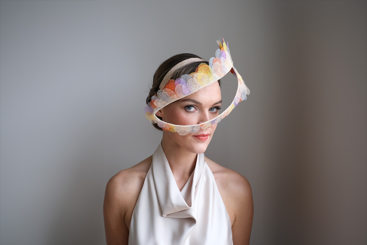 This headpiece is in the shape of an eye on a headband. To Margret Porwoll, it is an eye that perceives individual dots of colour and absorbs them. The eye becomes the image, and the image becomes the eye.