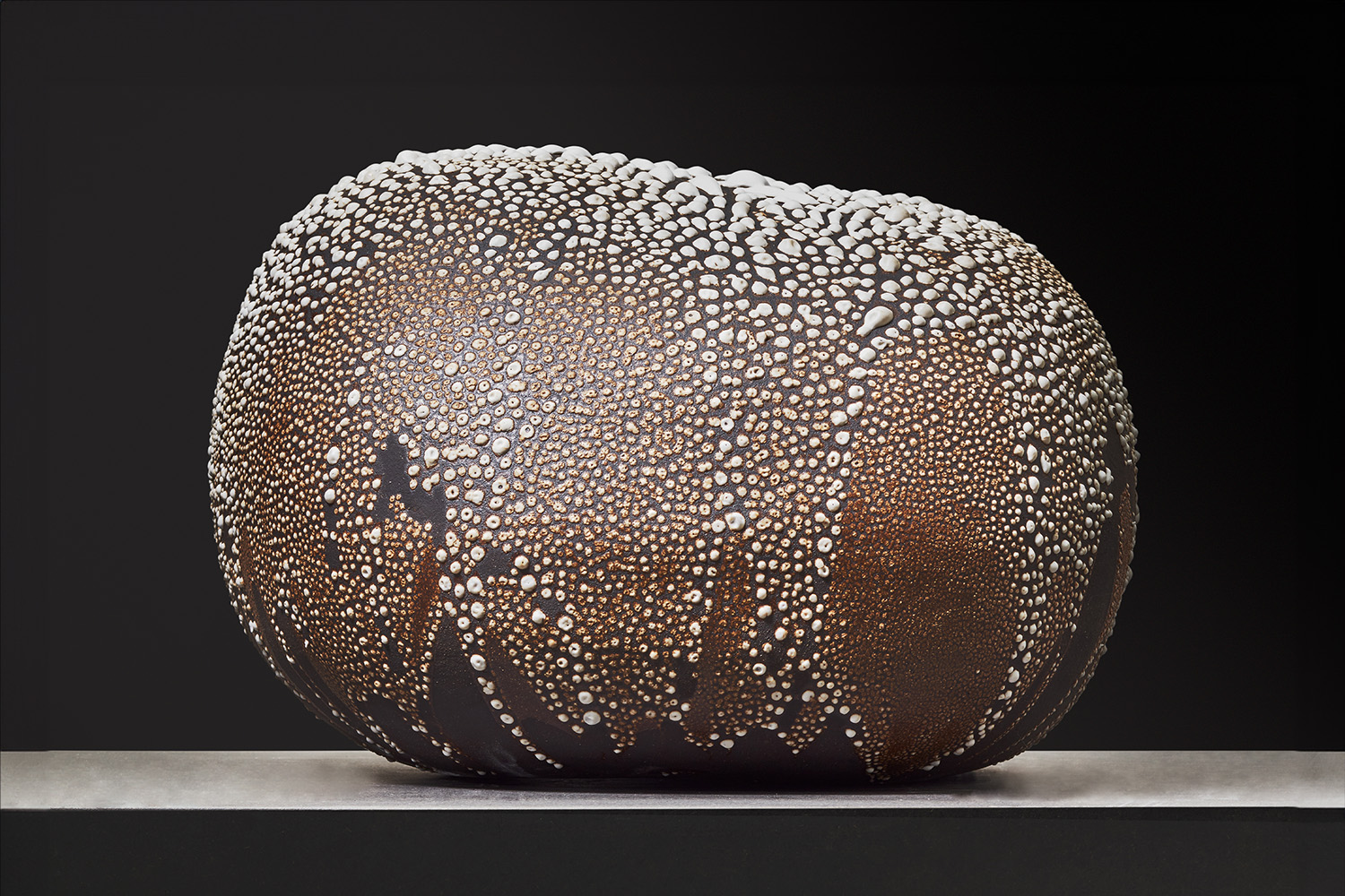 This sculpture in the shape of a stone is made from ceramics with the help of a pre-prepared plaster cast. Craquelé glaze was applied for the second firing so the sculpture features raised bubbles of glaze. Fired at 1250°C, the sculpture can also be placed outdoors. The colour of the clay is brown and the glaze surface is white.