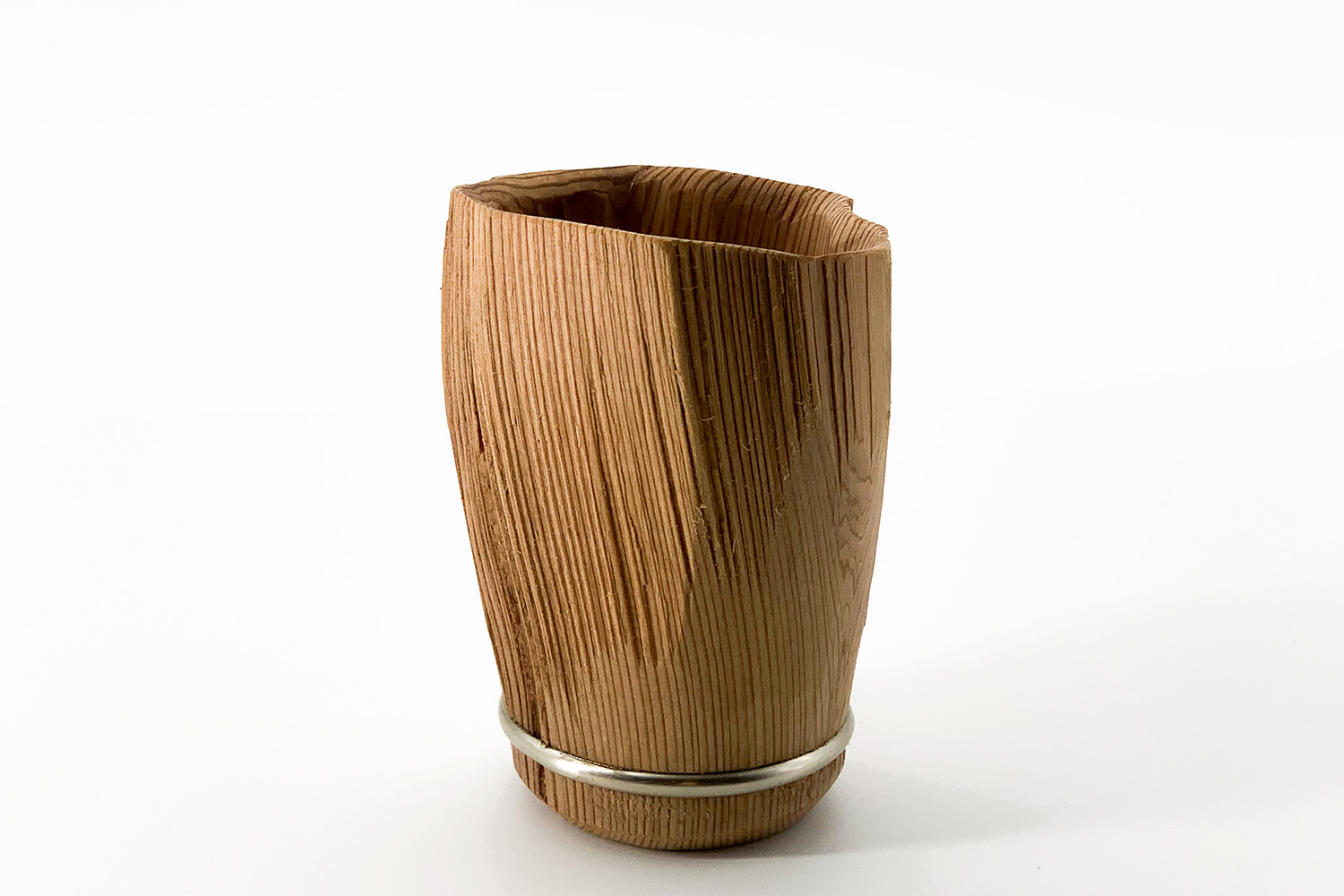 This cedar vase, with its irregular shape, is a perfectly waterproof container. It gives the illusion that it was made by hollowing out a log from a tree. But that is the beauty of making traditional kioke: in truth, it consists of a log broken into six pieces that have been assembled and glued together to create this organic shape.