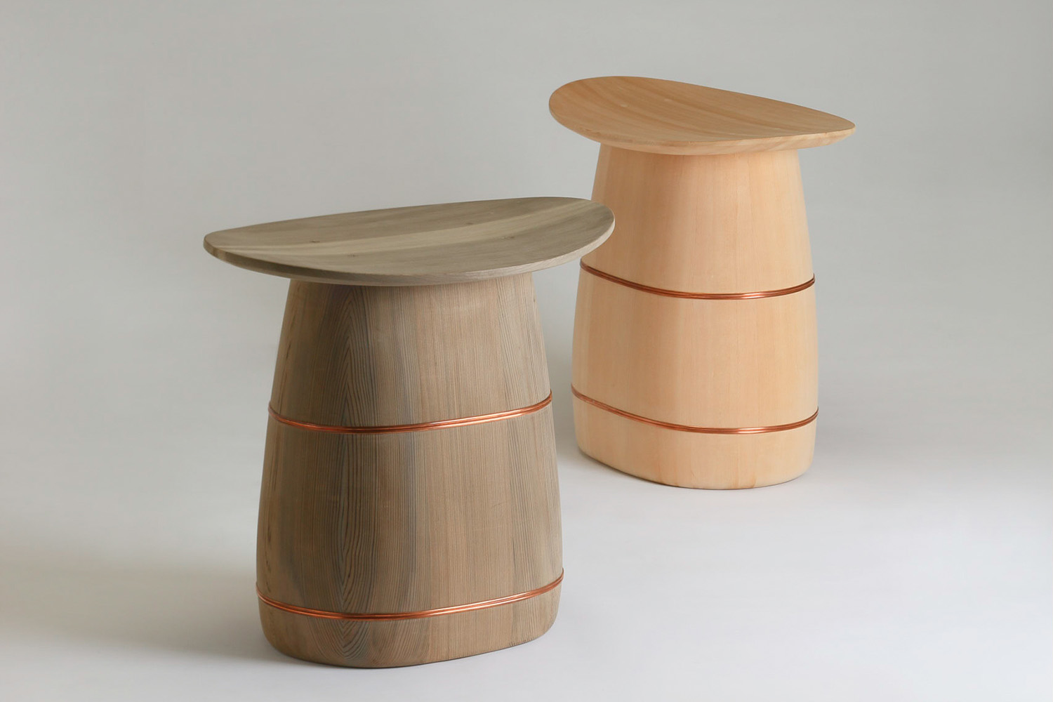 These bath stools are a collaboration between Shuji Nakagawa and Thomas Lykke from the OEO studio, as part of a project promoting Japanese craftsmanship. The foot of the stool is hollow on the inside, and the seal has been attached using metal nails. The darker stool is made from cedar, while the lighter one from cypress.