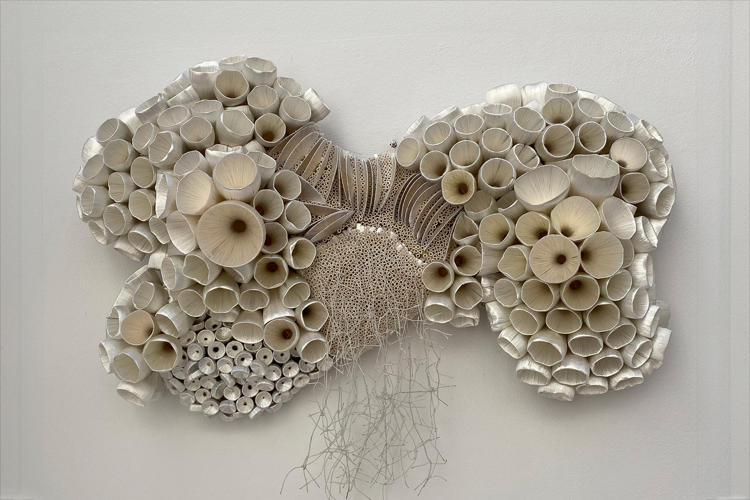 This white wall panel sculpture, composed of plastic waste enveloped in white silk thread, is part of the series called La Mer(e), Origine du Monde... It offers a close examination of sea corals, and explores the parallels between women and the sea.