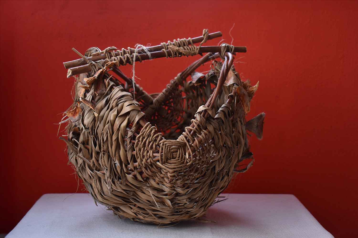This basket is woven onto a wicker structure. It is made of banana bark, dragon tree, bulrush, and New Zealand flax with a wicker structure.