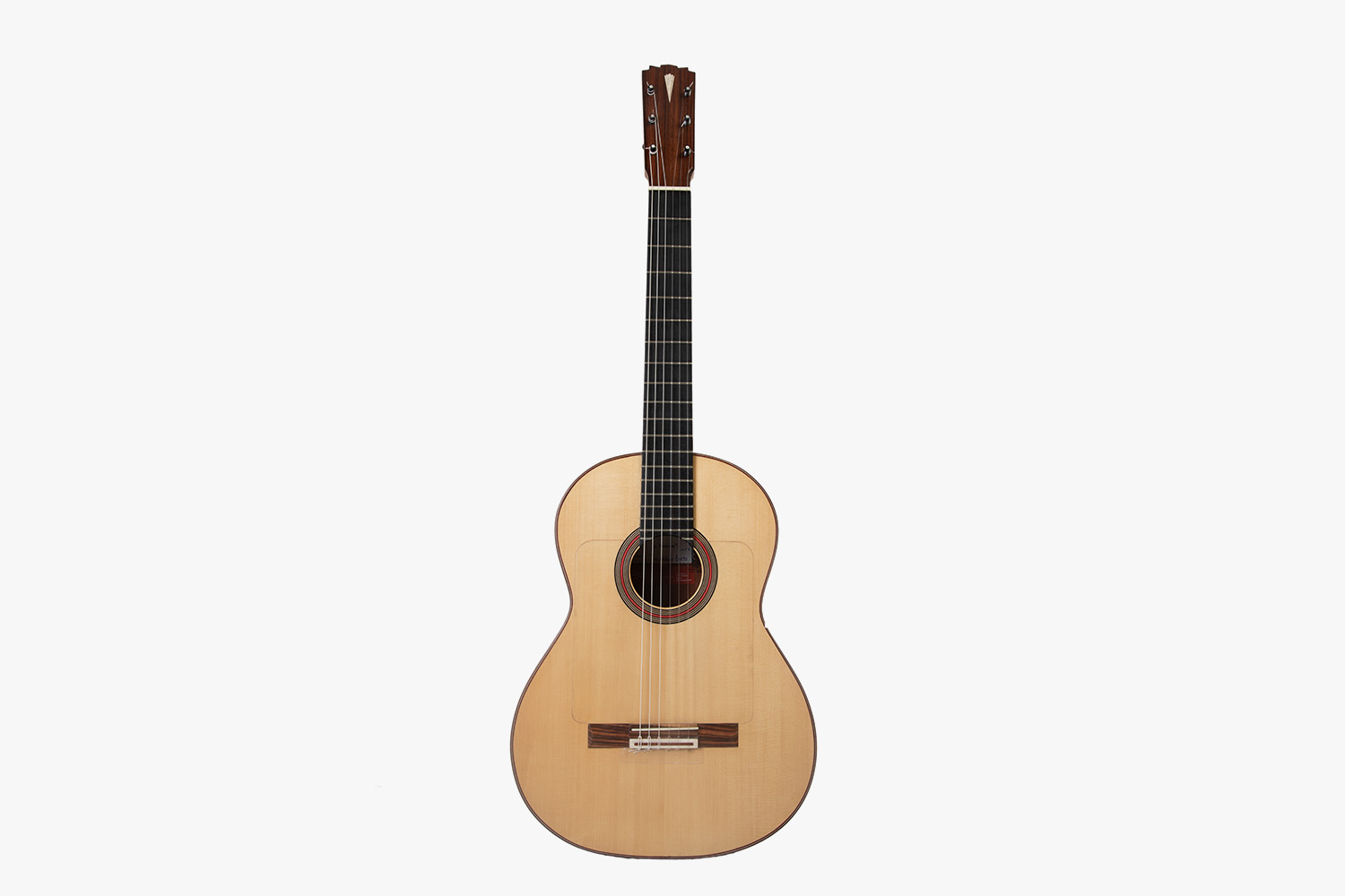 This is a concert guitar that has a series of decorative elements in bone on both sides of the guitar’s heel and another relief bone inlay on its headstock. The Padauk wood used for its construction is not very common, but its acoustic qualities are worth the hard work.