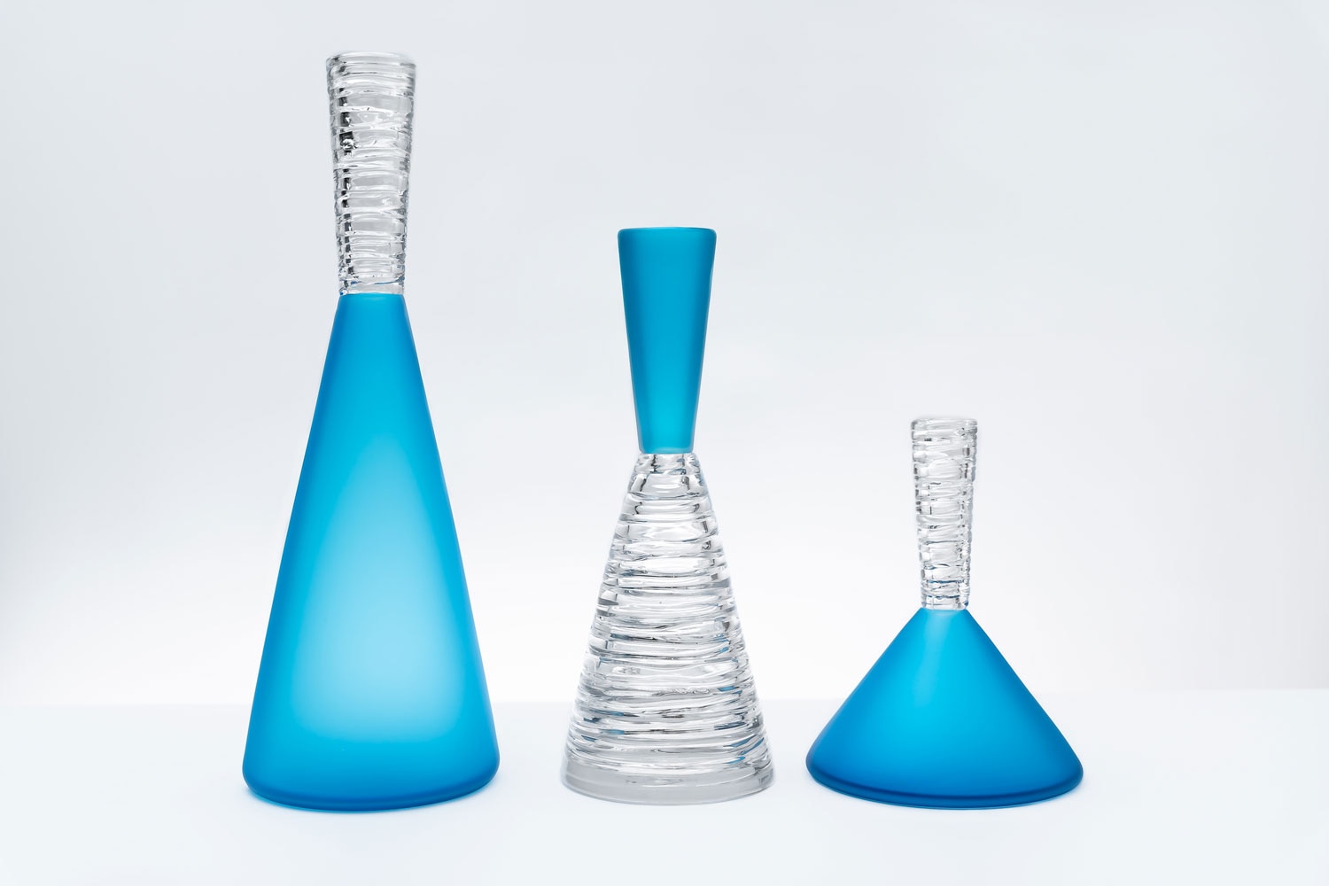 These three conical glass bottles feature variously arranged copper blue sections and clear layered sections. The shape references potions bottles and conical scientific flasks. Triangular blue sections in each create a distinctive and eye catching shape.
